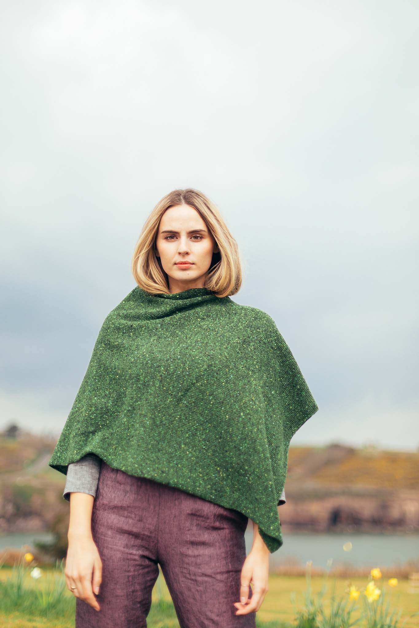 Katelyn is wearing the Benvoy Poncho in Forest Green.