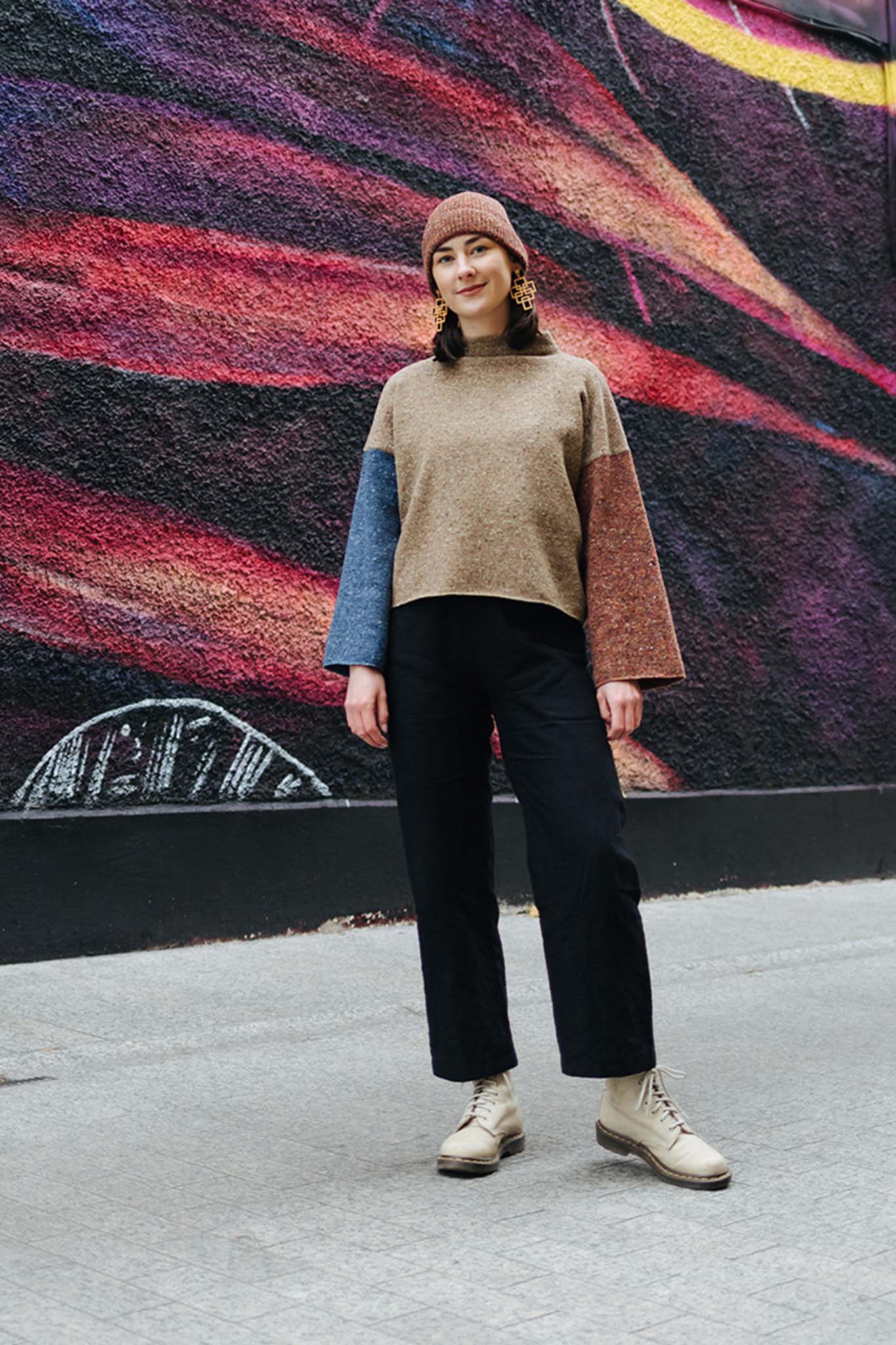 Mollie is pictured here wearing the Guillamene Jumper in Brown with Sunset and Denim Blue sleeves - Brown (B) | Sunset (S1) | Denim Blue (S2)