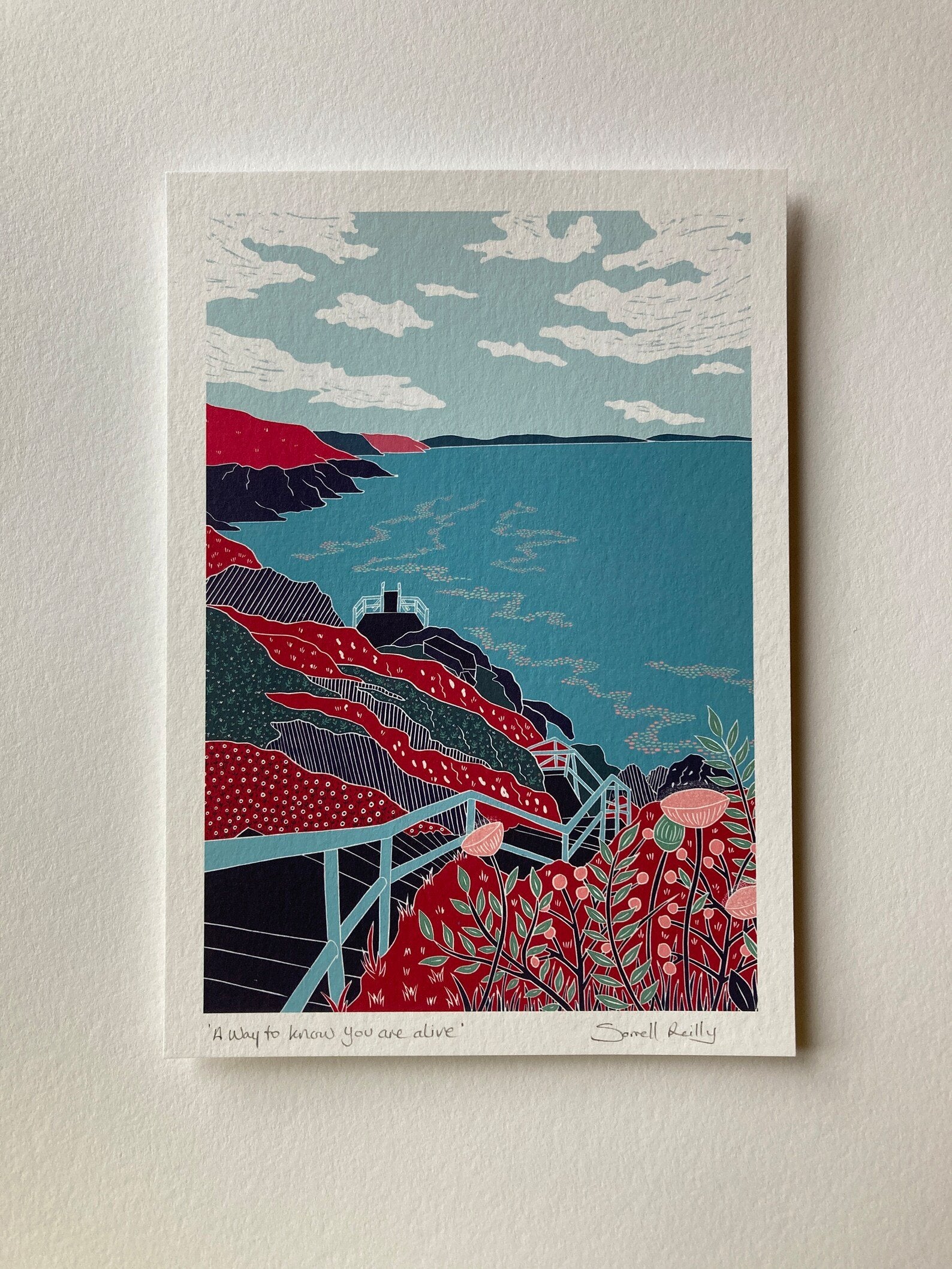Original handmade print of Guillamene Swimming Cove in Co. Waterford by Sorrell Reilly