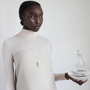 The Strata long necklace is unusual and delightful. This fresh water, white keshi pearl pendant comes on a 75cm chain. The iridescent pearl contrasts beautiful against the textured gold or silver. Each free form pearl is unique and measures approximately 20mm to 30mm.