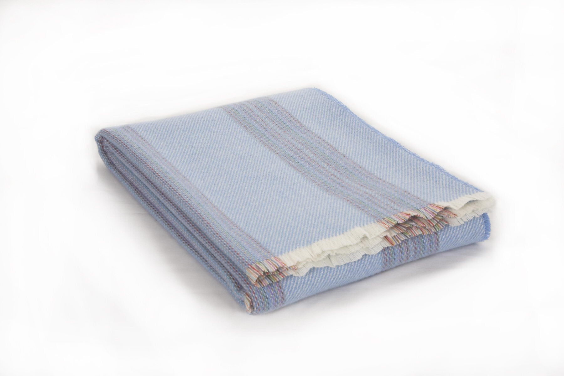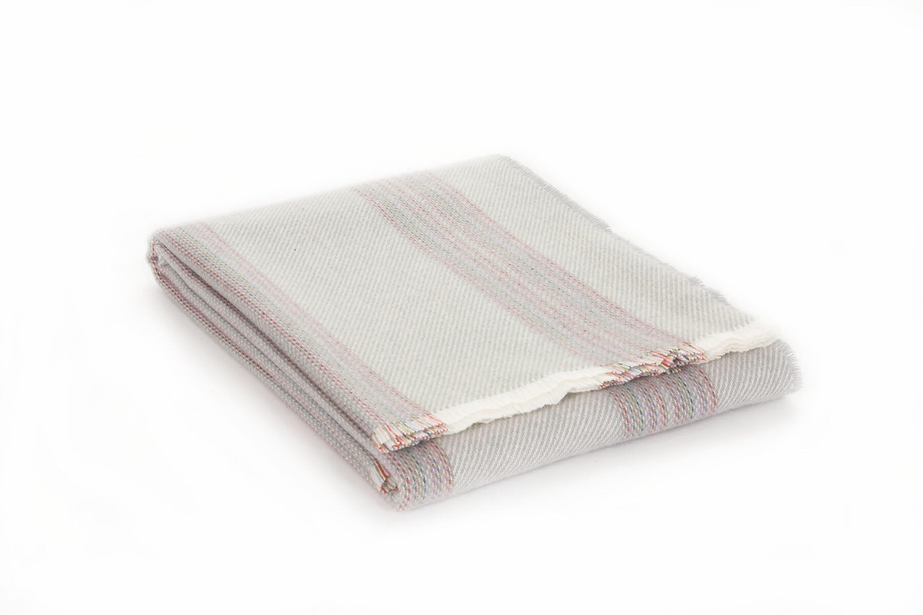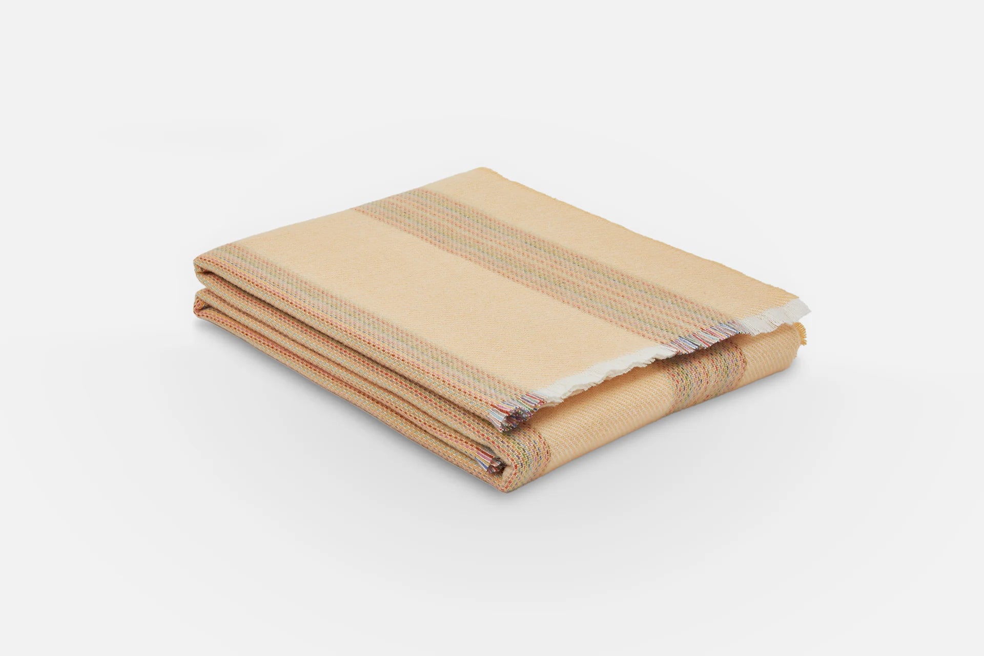 ‘Our signature rainbow lambswool throw is light, bright and brings a smile all year round. Woven on a fresh ecru base, our thirty-six rainbow coloured yarn threads combine across a range of shades creating this very distinctive throw.