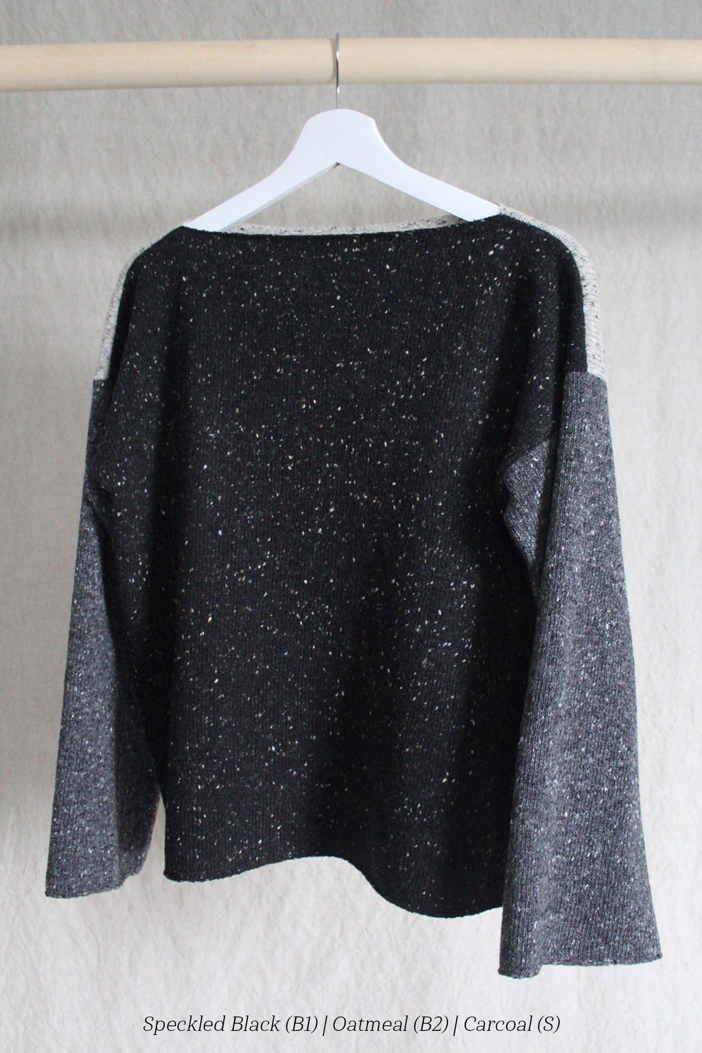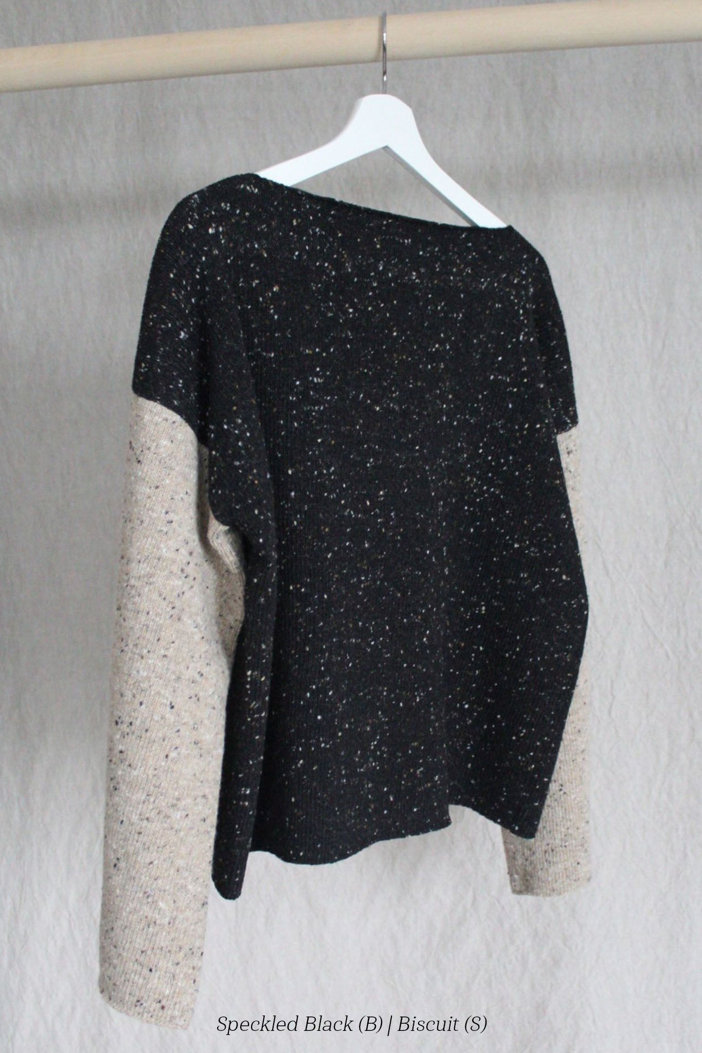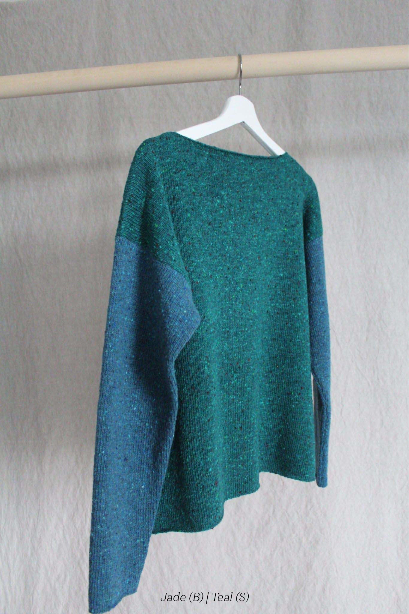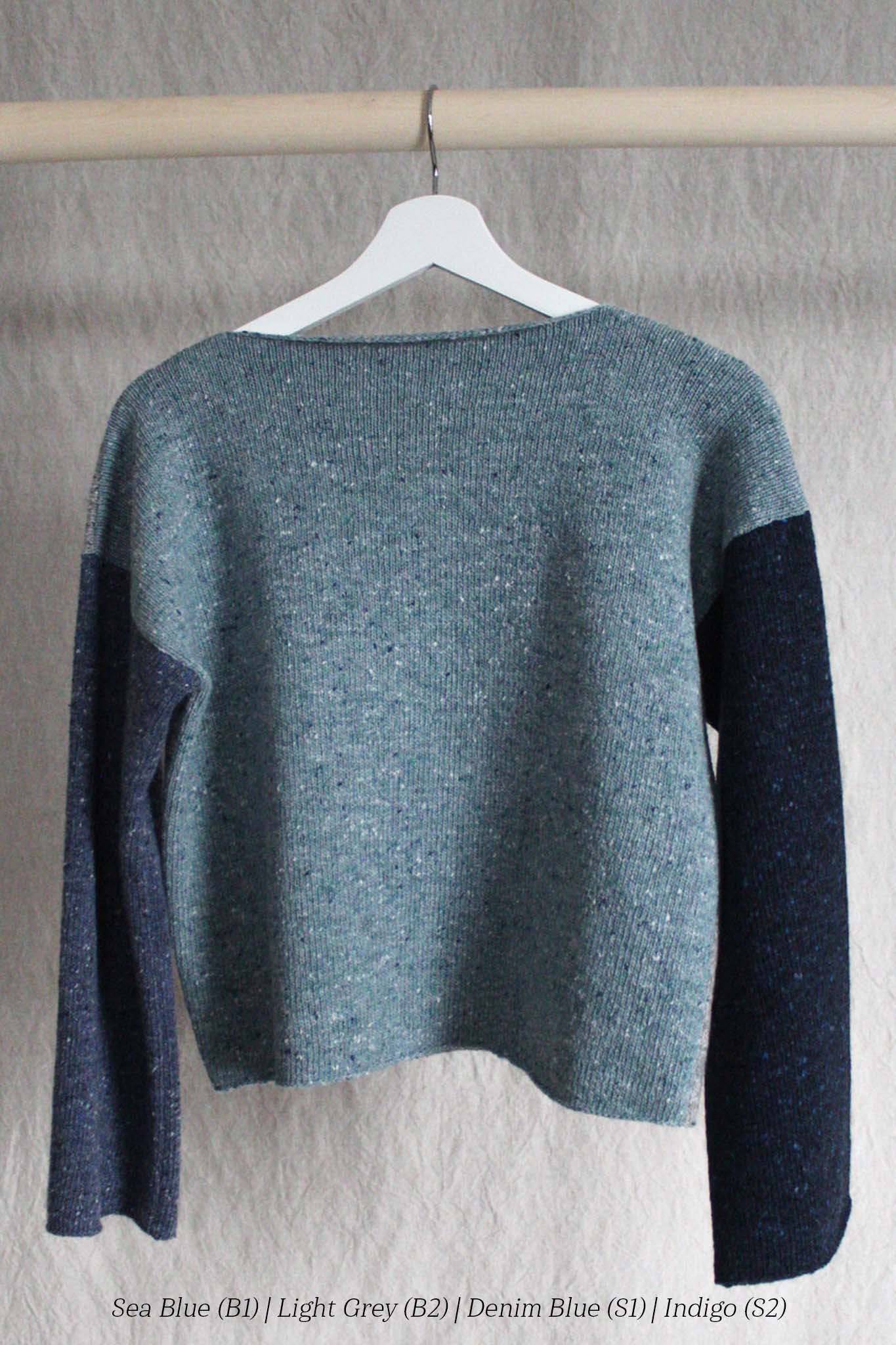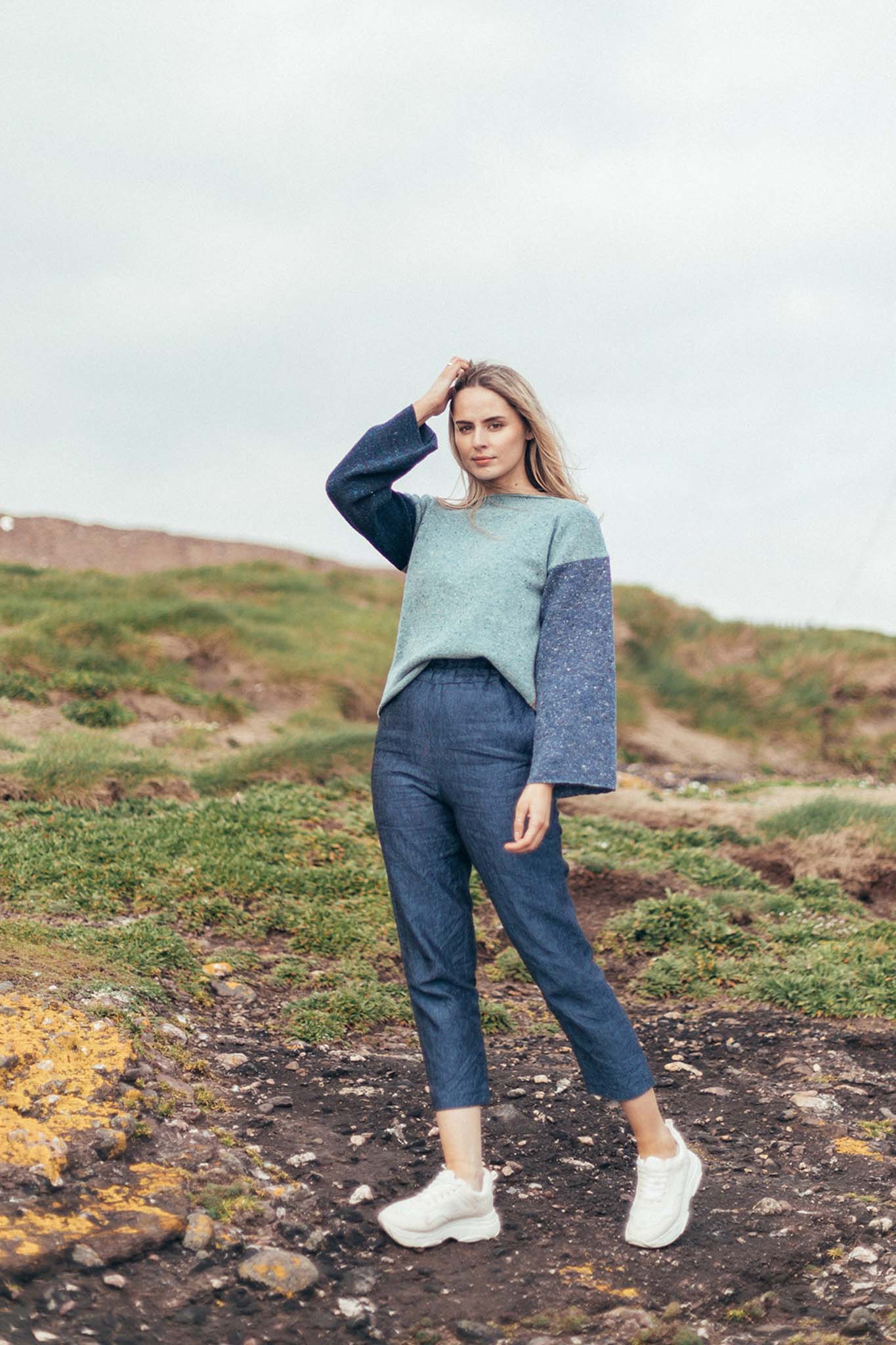 Katelyn is pictured wearing the Saleen Jumper in Sea Blue & Light Grey body with Denim and Indigo sleeves - Sea Blue (B1) | Light Grey (B2) | Denim Blue (S1) | Indigo (S2)