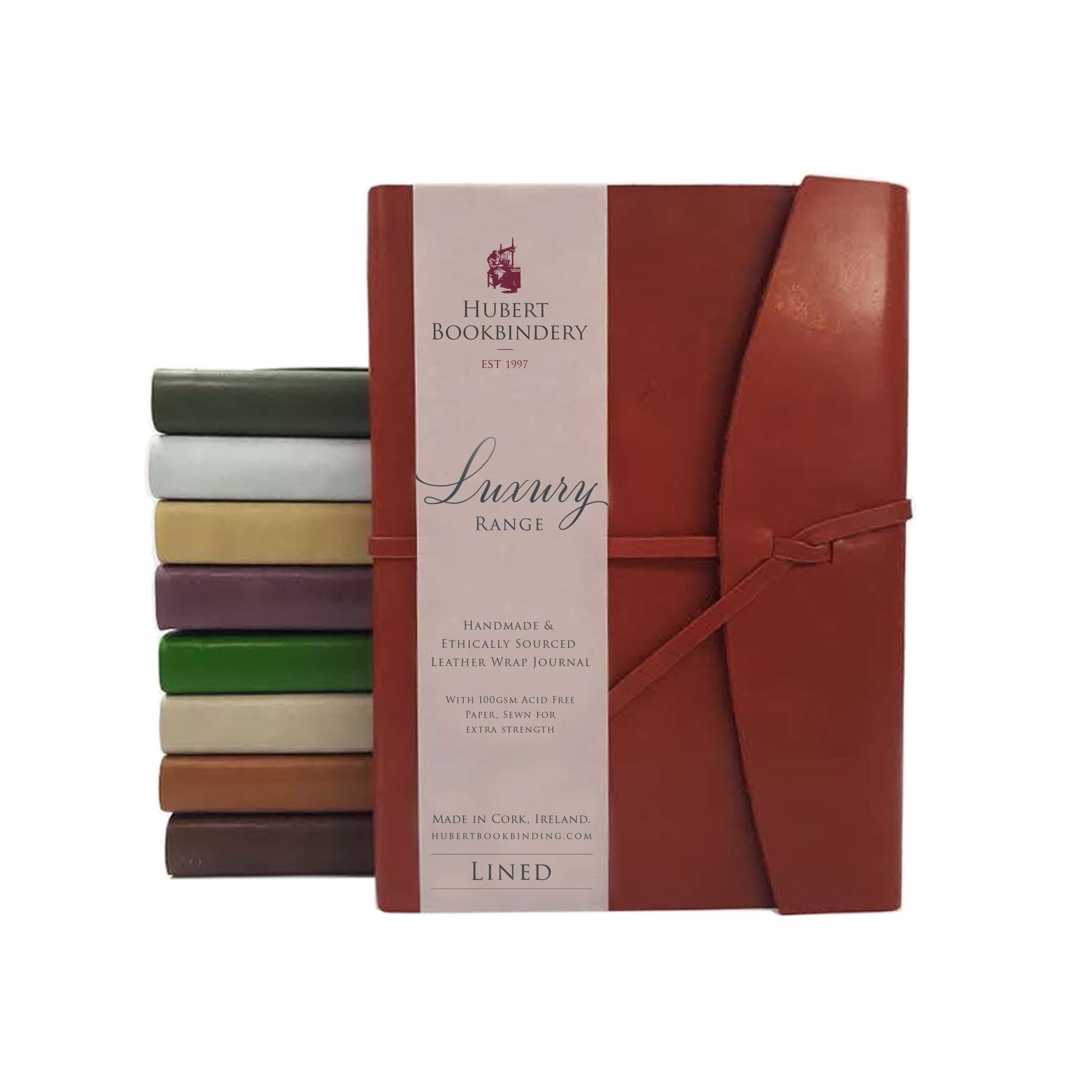 This Luxury Leather Wrap Journal is brought to you by Hubert Bookbindery. The handmade Luxury Leather Wrap Journal is perfect for keeping your notes, sketches and lists. The design is simple yet elegant, using one colour and tied with a fold over flap, bound using the softest leather. Each journal contains 140 leaves of high quality cream 100gsm writing paper. Each notebook is stitched together for writing and drawing ease.