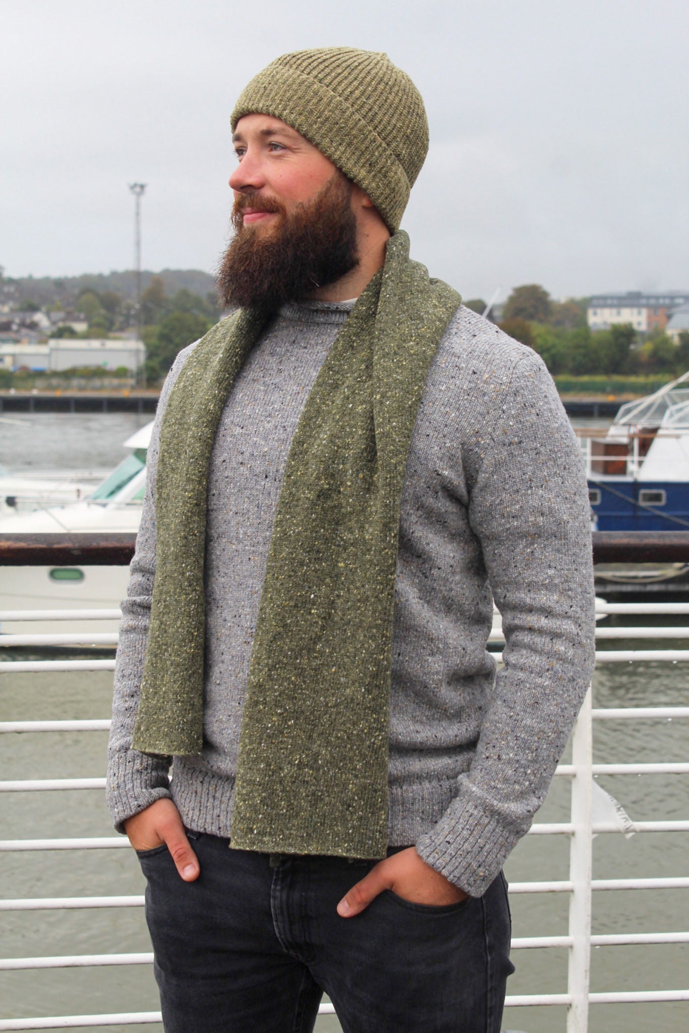 Barry is wearing the Shanoon Men's Jumper in Light Grey, paired with our Classic Scarf in Comeragh Green and The Harbour Hat in Sage.