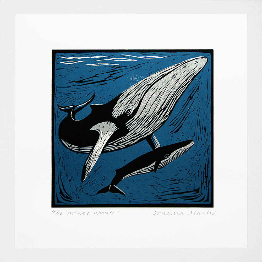 ‘A digital print featuring my linocut of a minke whale with its calf. This image is from my linocut print of a Minke Whale. I was thrilled to see my first whale recently when it swam near our boat off the west coast of Scotland. Deep blue, grey, black, graphic, emotive, a mother whale looks at the viewer whilst protecting it’s calf. As I carved the image I used the marks to give form to the sea creatures and a feeling of movement in the sea.