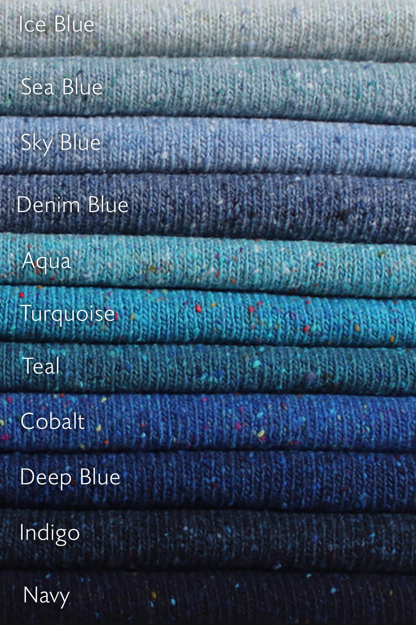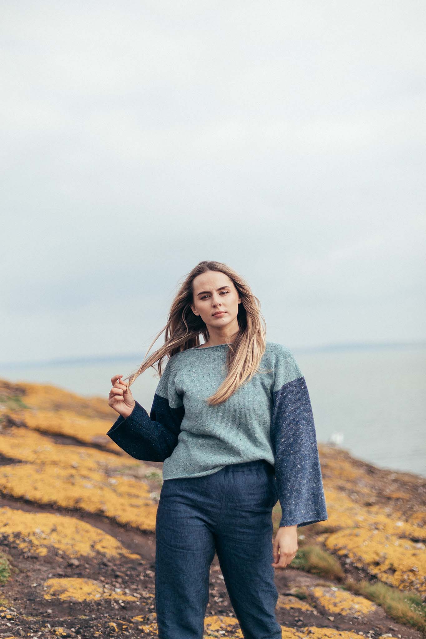 Katelyn is pictured wearing the Saleen Jumper in Sea Blue & Light Grey body with Denim and Indigo sleeves - Sea Blue (B1) | Light Grey (B2) | Denim Blue (S1) | Indigo (S2)